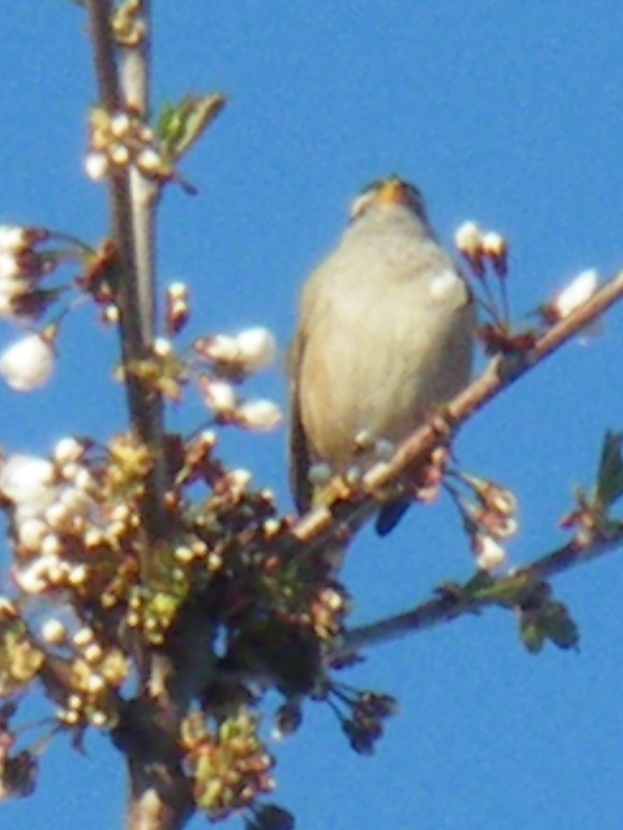 Unidentified bird. Maybe a White-crowned Sparrow. Spotted in the front yard tree. See IMGP2206_bird_maybe_White-crowned_Sparrow_large.AVI for its song. Info.