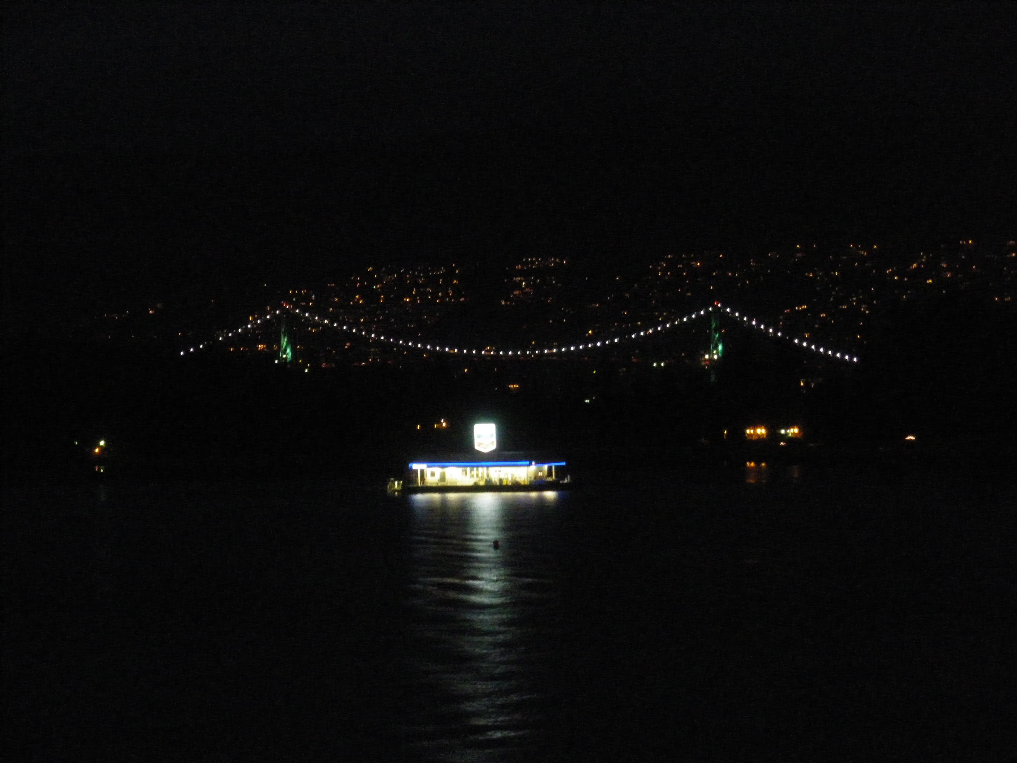 Vancouver Burrard Inlet. Floating Chevron gas station. (Stanley Park.) Lion's Gate Bridge. West Vancouver.