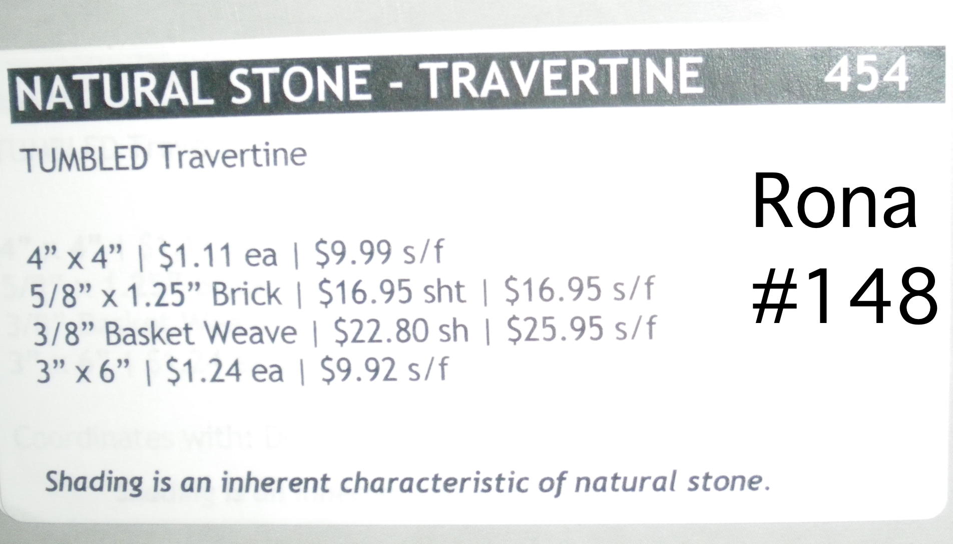 A natural stone travertine tile found at Rona, Jan 2010. Price and size details.